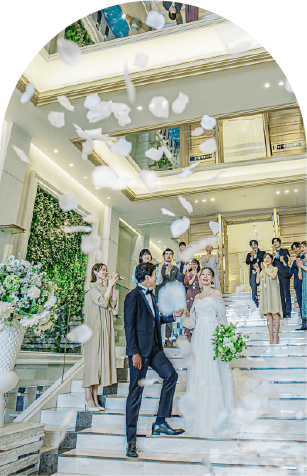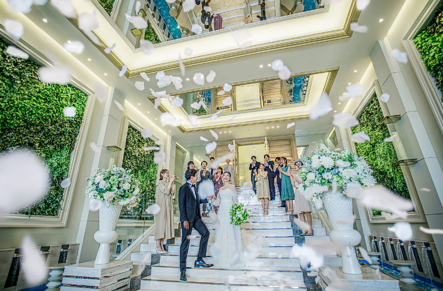 挙式後は、全天候型の室内大階段でフラワーシャワー。