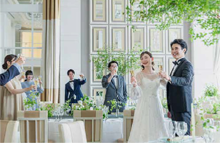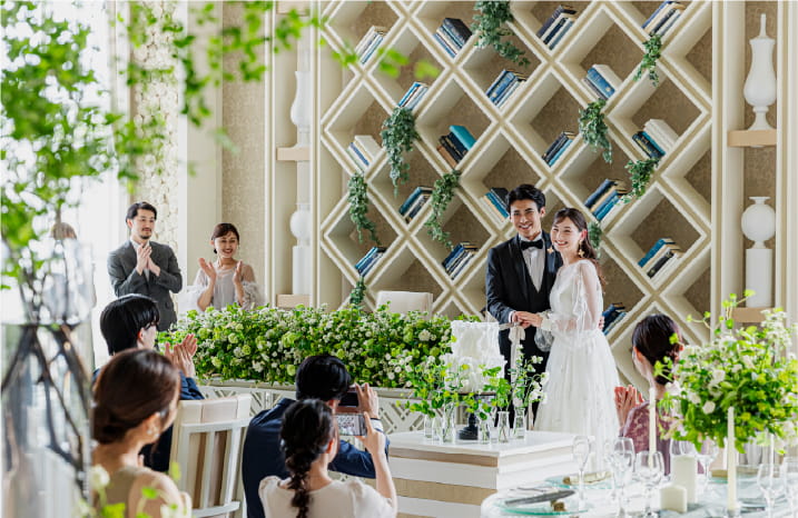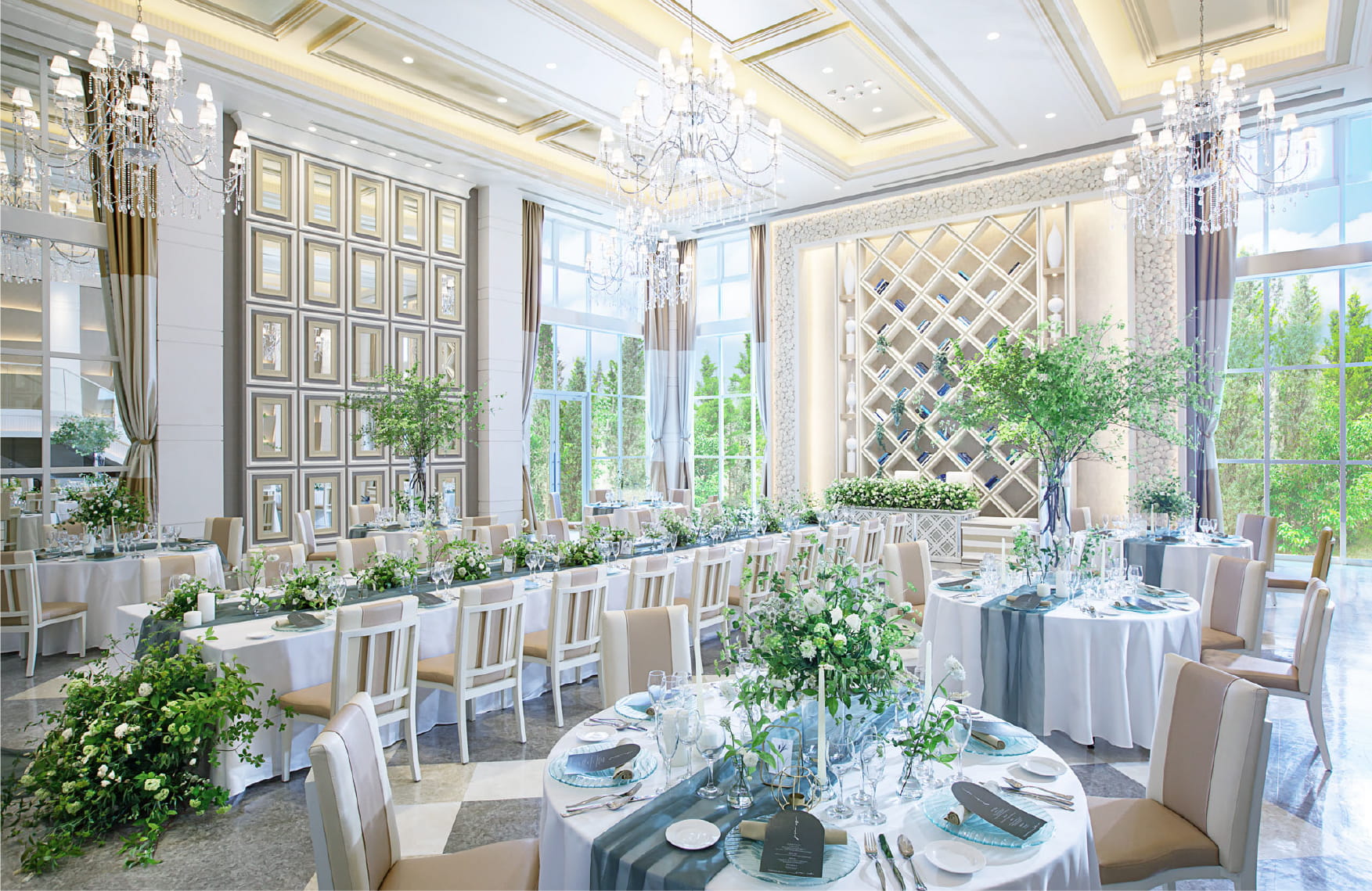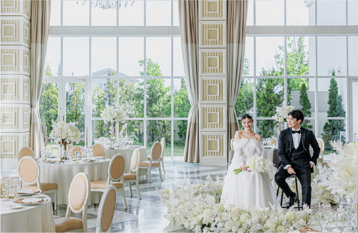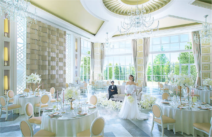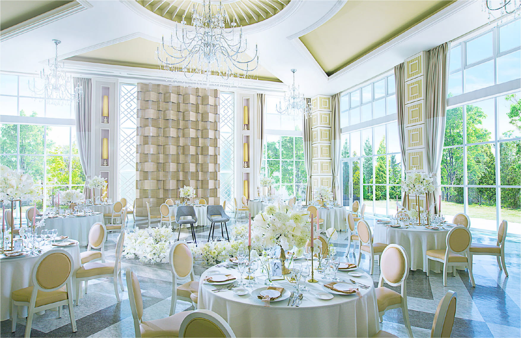 大きな二面窓から自然光が差し込むワンランク上の贅沢空間。大階段からの入場や最新の演出など華やかなパーティをご希望のおふたりにぴったりの会場です。