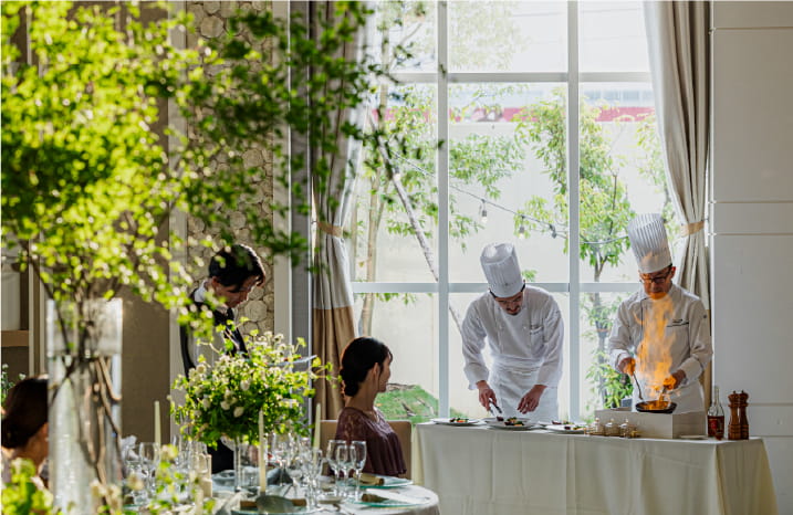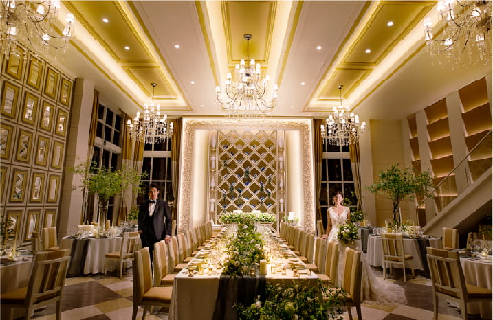 ゲストとふれあえるほどよい距離感が魅力のラグジュアリーな会場。自宅に招いたようなアットホームで落ち着いたパーティをお楽しみいただけます。