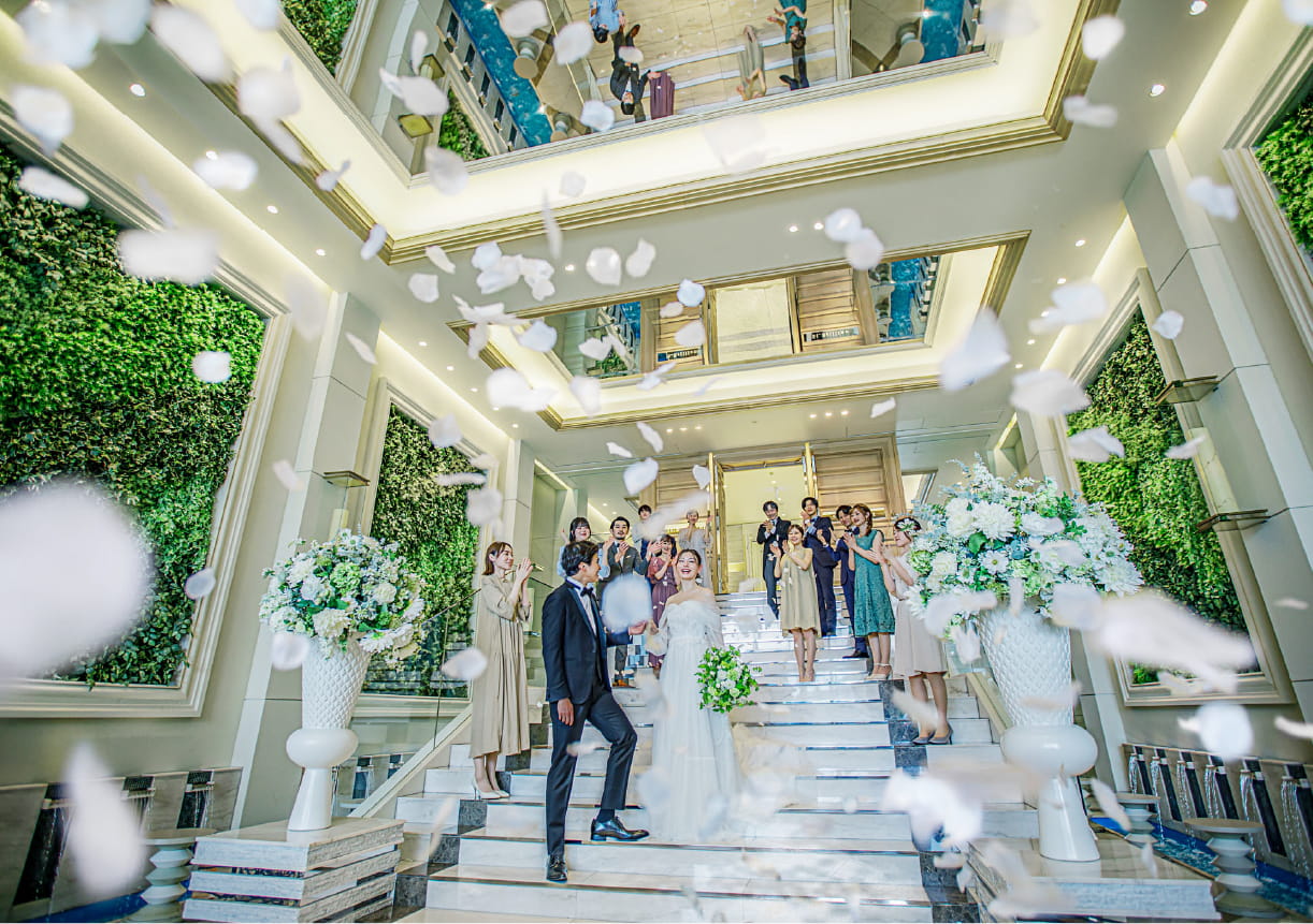 大階段でのフラワーシャワーはまるで映画のワンシーンのよう。