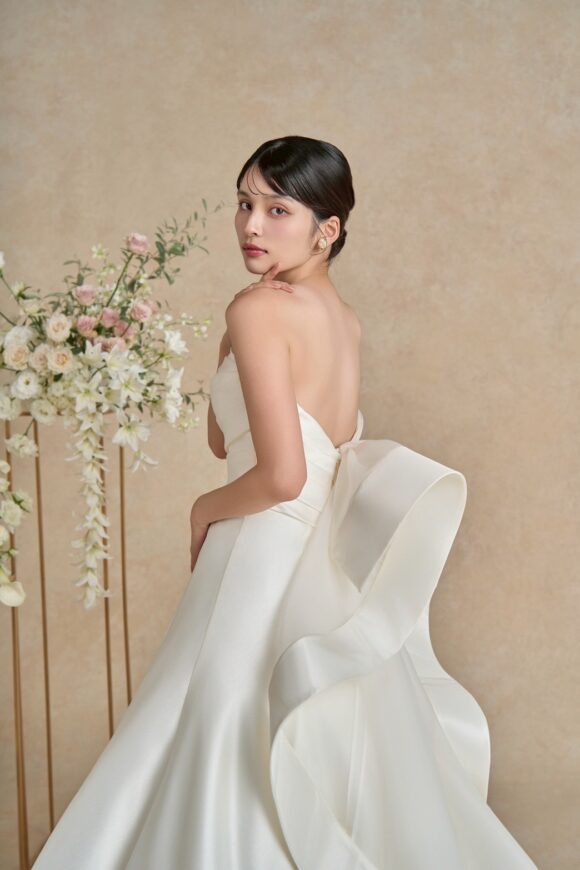 正面の静けさとは対照的に、背中に添えたリボンフリルは凛とした華やかさをプラス。