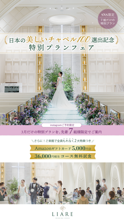 このたびLIAREリアーレのチャペルが「日本の美しいチャペル100選」に選出されたことを記念し、Instagramからのご予約限定の特別プランを先着7組様限定でご案内いたします。