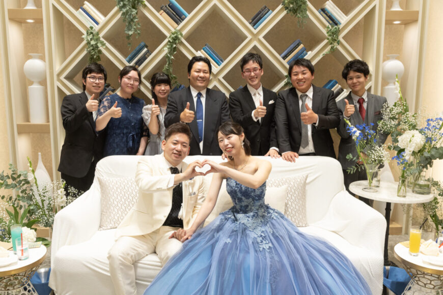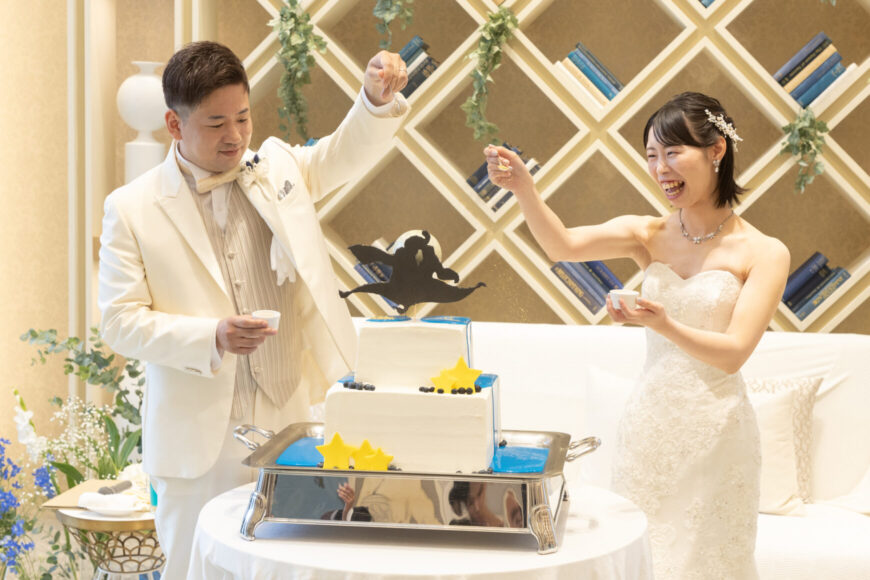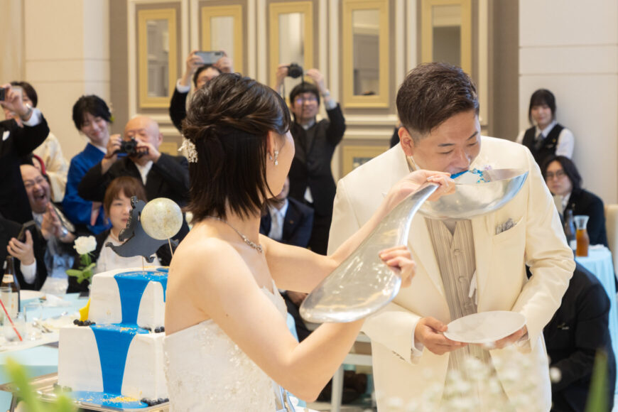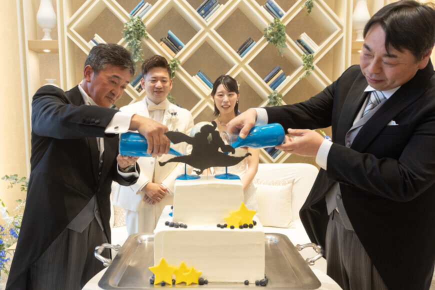 ケーキのブルーが象徴するのは、澄み渡る空のようにまっすぐなおふたりの未来。