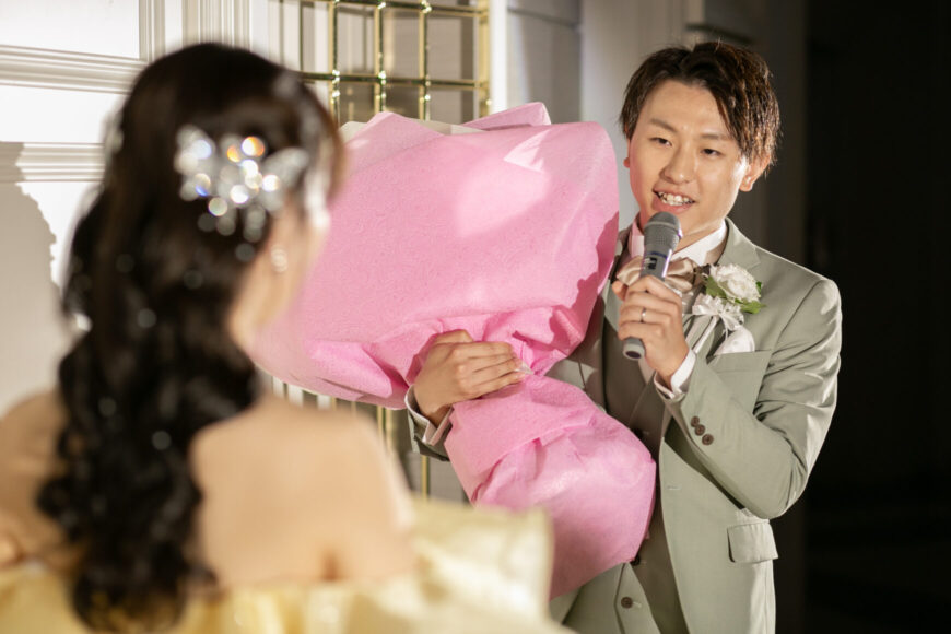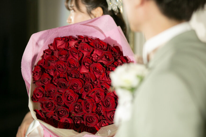 そして結びのシーンでは、100本の赤いバラに込めた想いが新婦さまの心にまっすぐ届き、