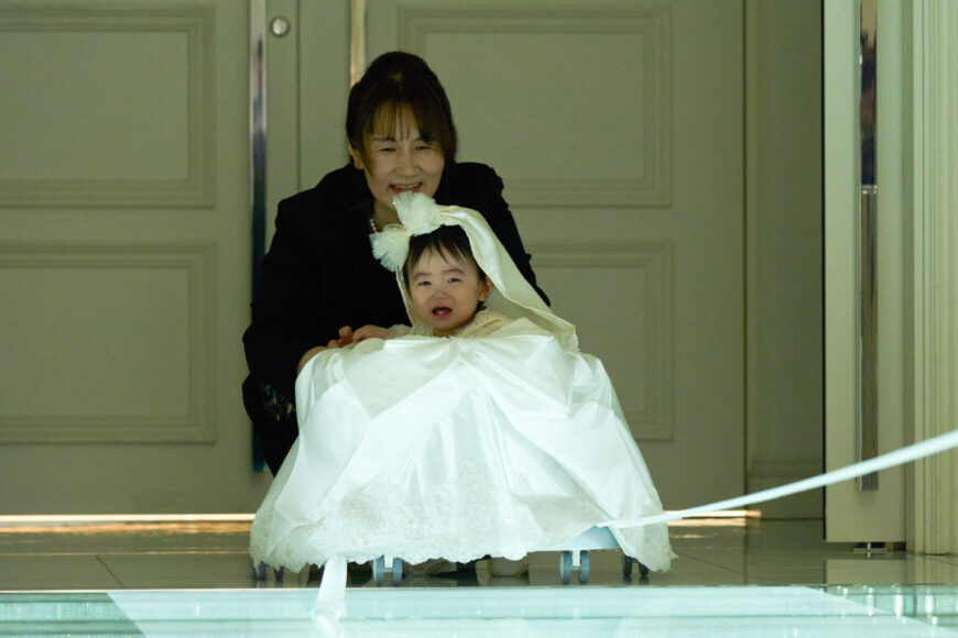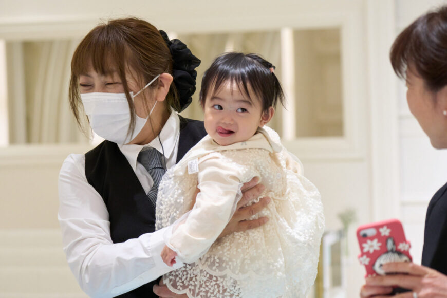 赤ちゃんを抱きしめながらゲストに「ありがとう」と言葉を交わすおふたりの姿に、