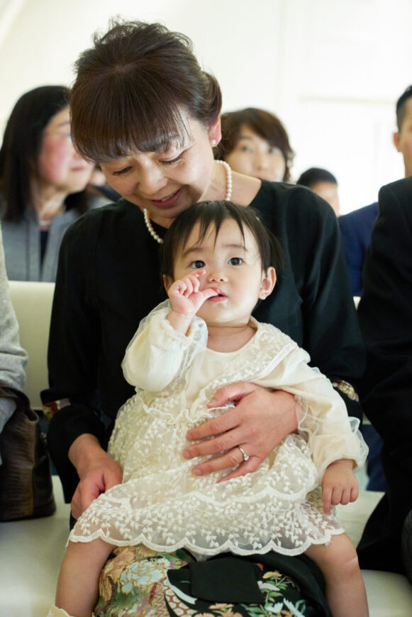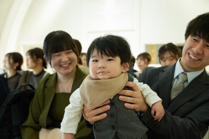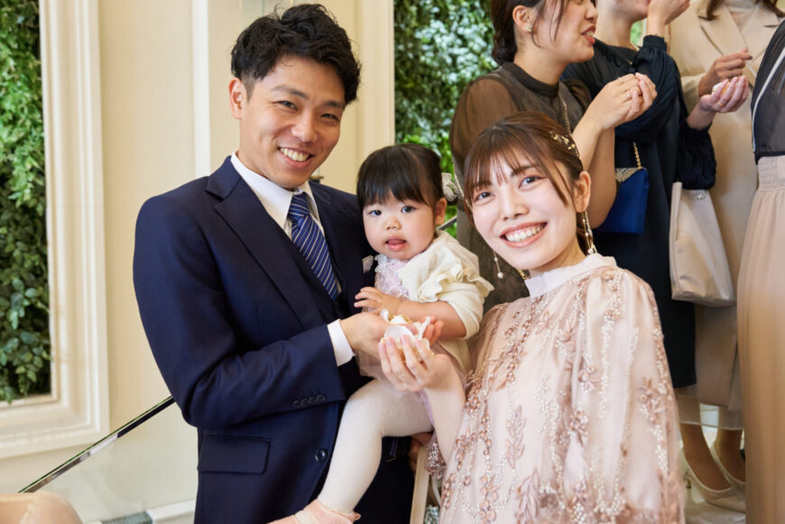 優しく赤ちゃんを抱きかかえた新郎様の表情には、父としての誇りと温もりがあふれ、