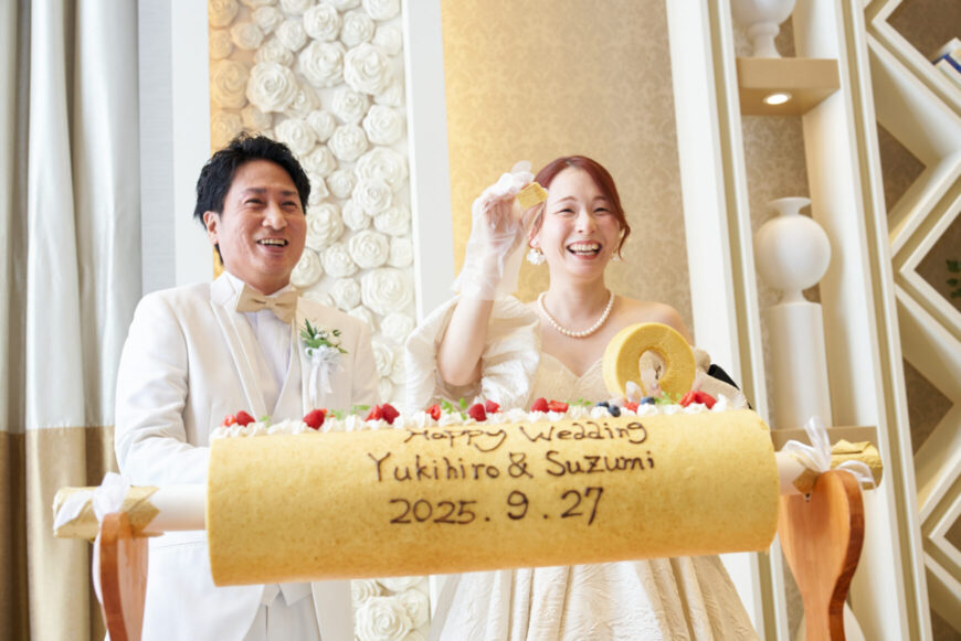 巨大なロールケーキ入刀では会場中が歓声と拍手に包まれました。