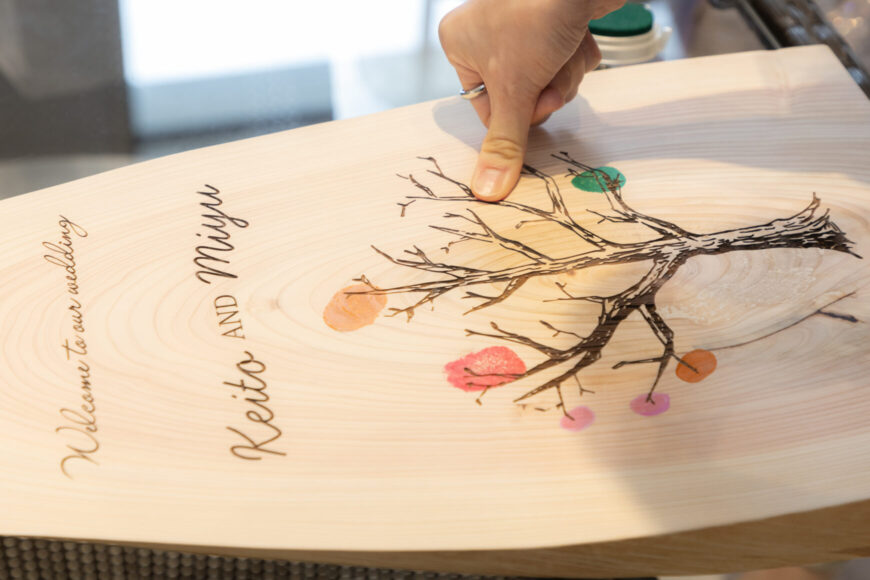 木の年輪のように温かみのあるボードに、おふたりとゲストの想いを刻んだウエディングツリー。