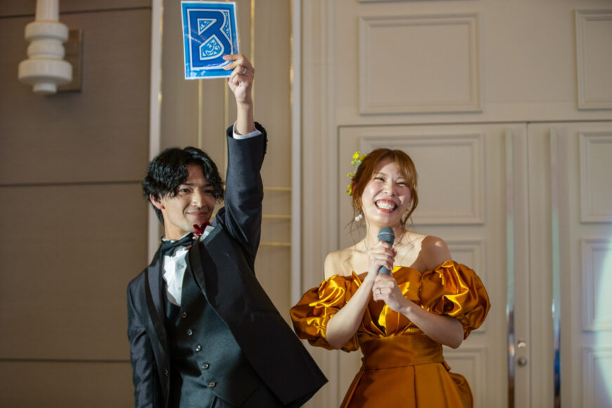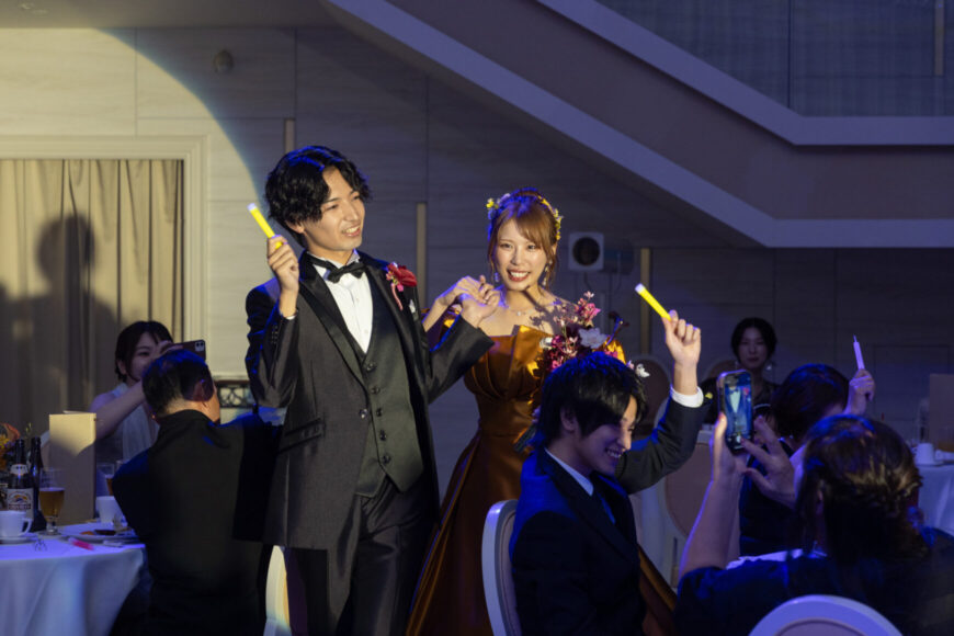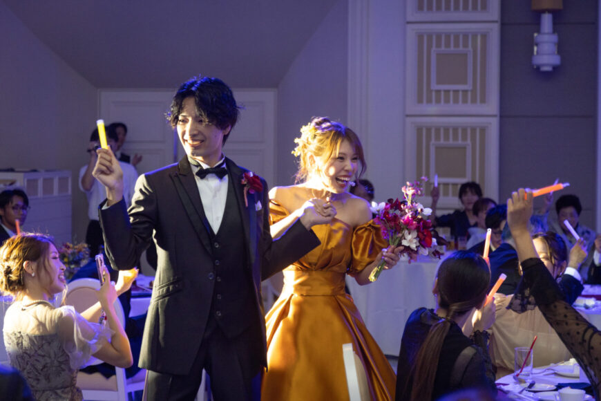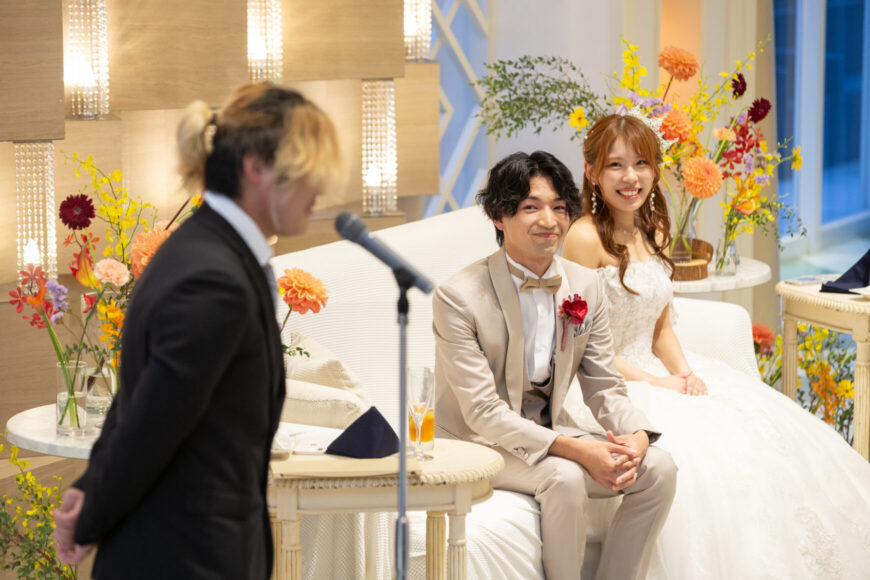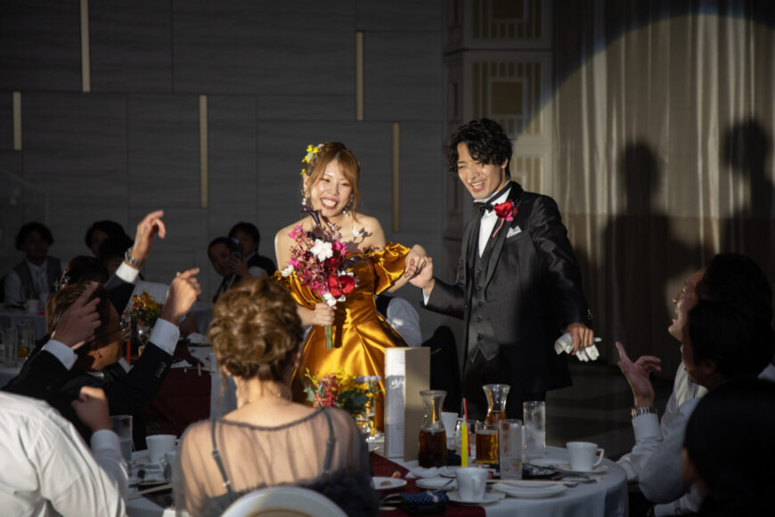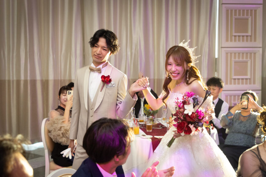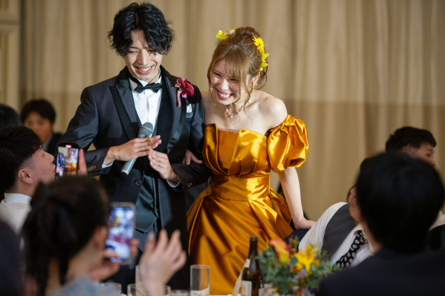 チャペルでの厳かな雰囲気から一転、披露宴ではふたりらしい明るさと笑顔が溢れ、