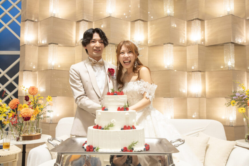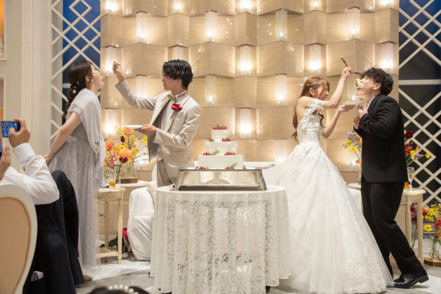 ケーキ入刀の瞬間にはゲストの笑顔と歓声が一気に広がりました。